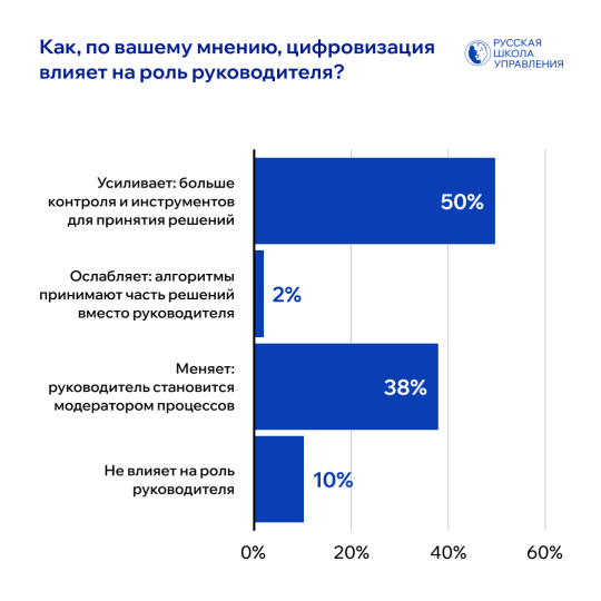 Главный вывод исследования: руководитель не исчезает, а трансформируется. Цифровизация усиливает его позиции: 50% опрошенных отмечают, что новые инструменты дают больше контроля и помогают принимать решения быстрее и точнее. Еще 38% видят будущее руководителя в роли модератора процессов — того, кто координирует команду, направляет ресурсы и управляет информационными потоками.